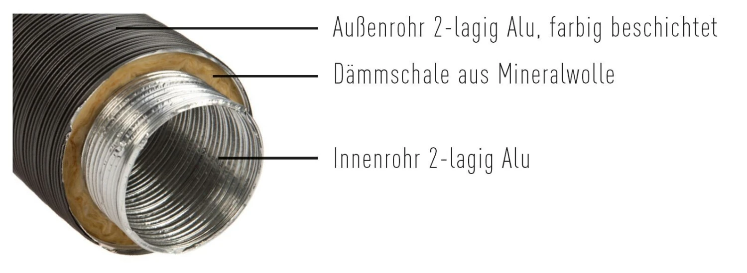 Die aufwendig gearbeiteten Alu-Isolierflexrohre bestehen aus 5 Lagen: